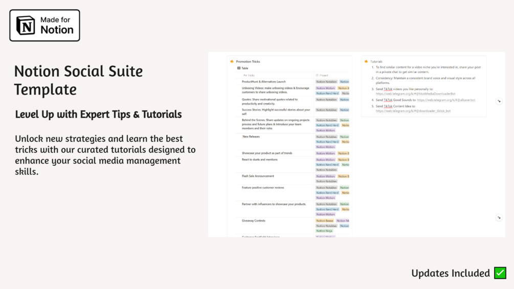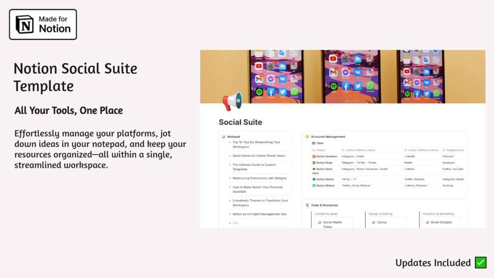 Take control of your content strategy and stay organized across all your platforms! Social Suite is built for creators, teams, and brands who want to plan, track, and growβall from a single Notion workspace.