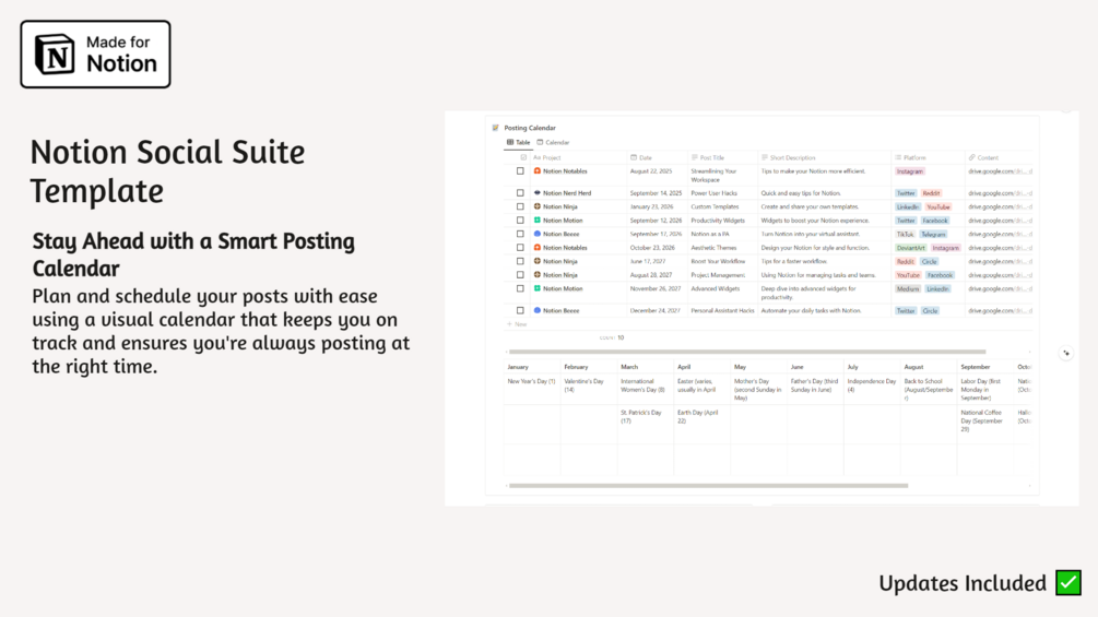 Take control of your content strategy and stay organized across all your platforms! Social Suite is built for creators, teams, and brands who want to plan, track, and growβall from a single Notion workspace.